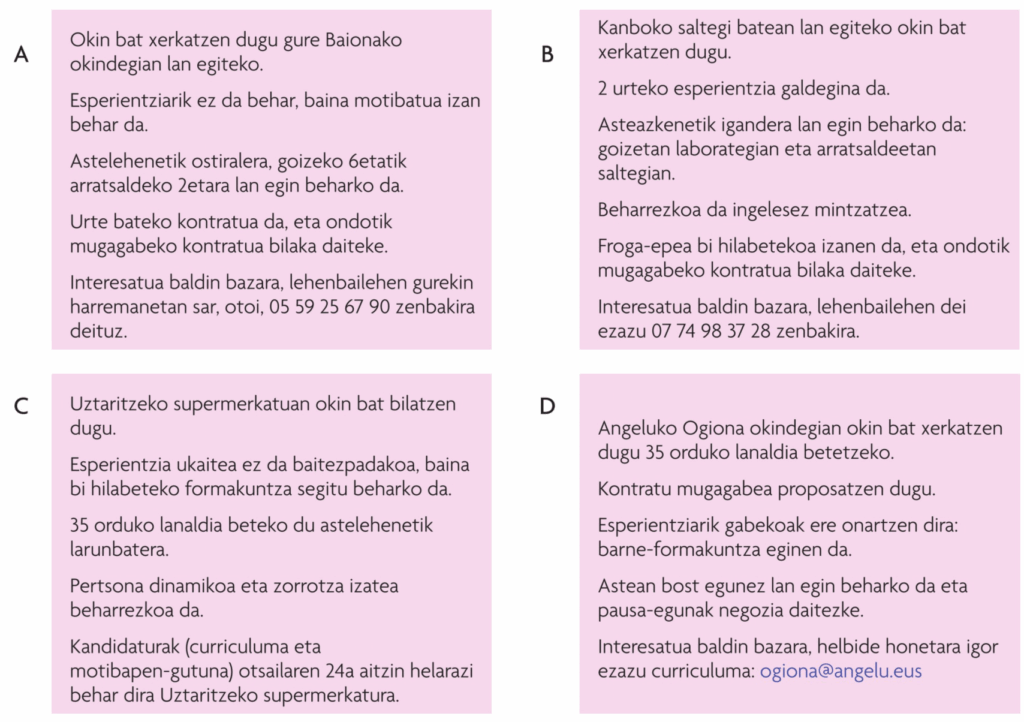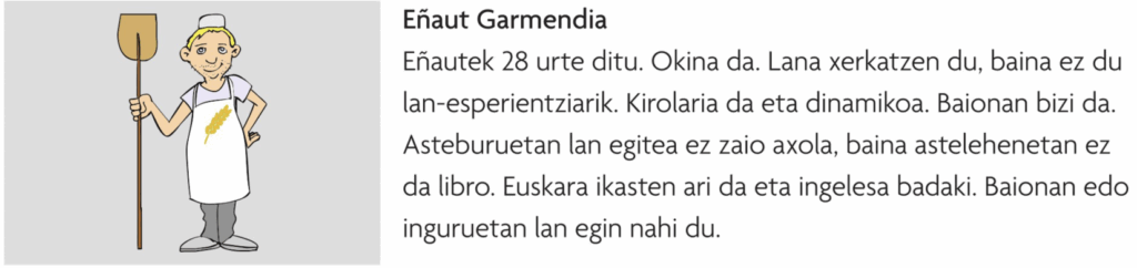 Behereko lan eskaintzak irakurri ondoan, idatz ezazu zein hautatuko duen Eñautek eta zergatik.